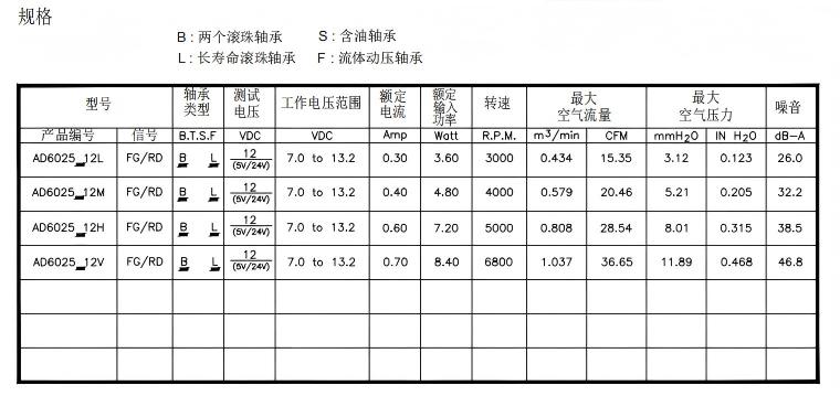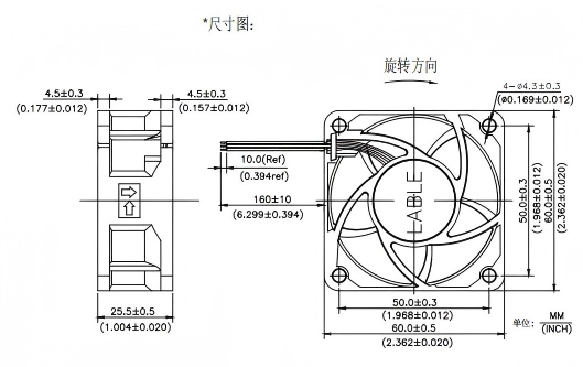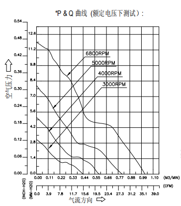 材料: 扇叶和框:塑料(UL 94V-0)。 导线:UL 1007 AWG #24 或同等品 扇叶片数:5片 旋转方向 CCW 从正面看 重量:55g